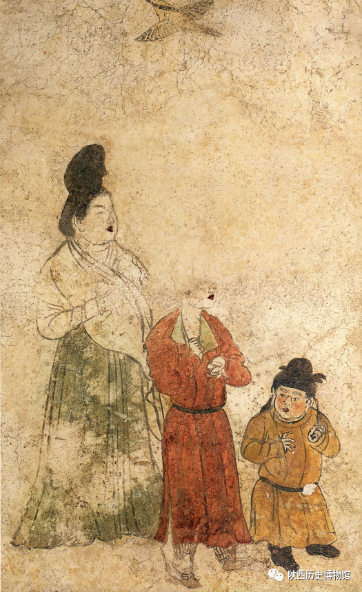 图中矮者,头戴黑幞头,穿圆领黄袍,黑长靴。疏眉大耳,大鼻朱唇,双手一高一低置于胸前,回首似在与身旁侍女比划着什么,神态滑稽、可掬。此人为宫廷专养的身材矮小的人,也称侏儒。中间一人朱唇圆脸,着红色翻领夹袍,腰系带,下穿波斯条纹裤,为男装侍女。后一侍女梳高髻,着白襦绿裙,披巾交于胸前,体态丰腴,雍容华贵。三人呈阶梯状排列,上方绘一展翅飞翔的黄鹏。这种用鸟补白的绘画形式在李贤墓中多处出现。侏儒,为宫内弄人,专门表演滑稽动作供人取乐。早在先秦时期就已出现,汉代更是宫廷贵族取乐的玩物。唐代文献中有许多皇宫中豢养侏儒的记载,壁画中侏儒形象的出现证实了文献记载之真实。
