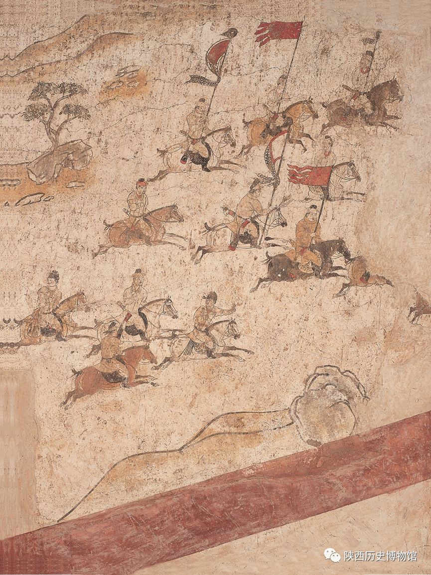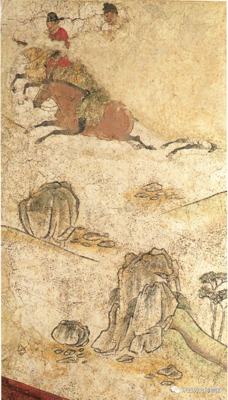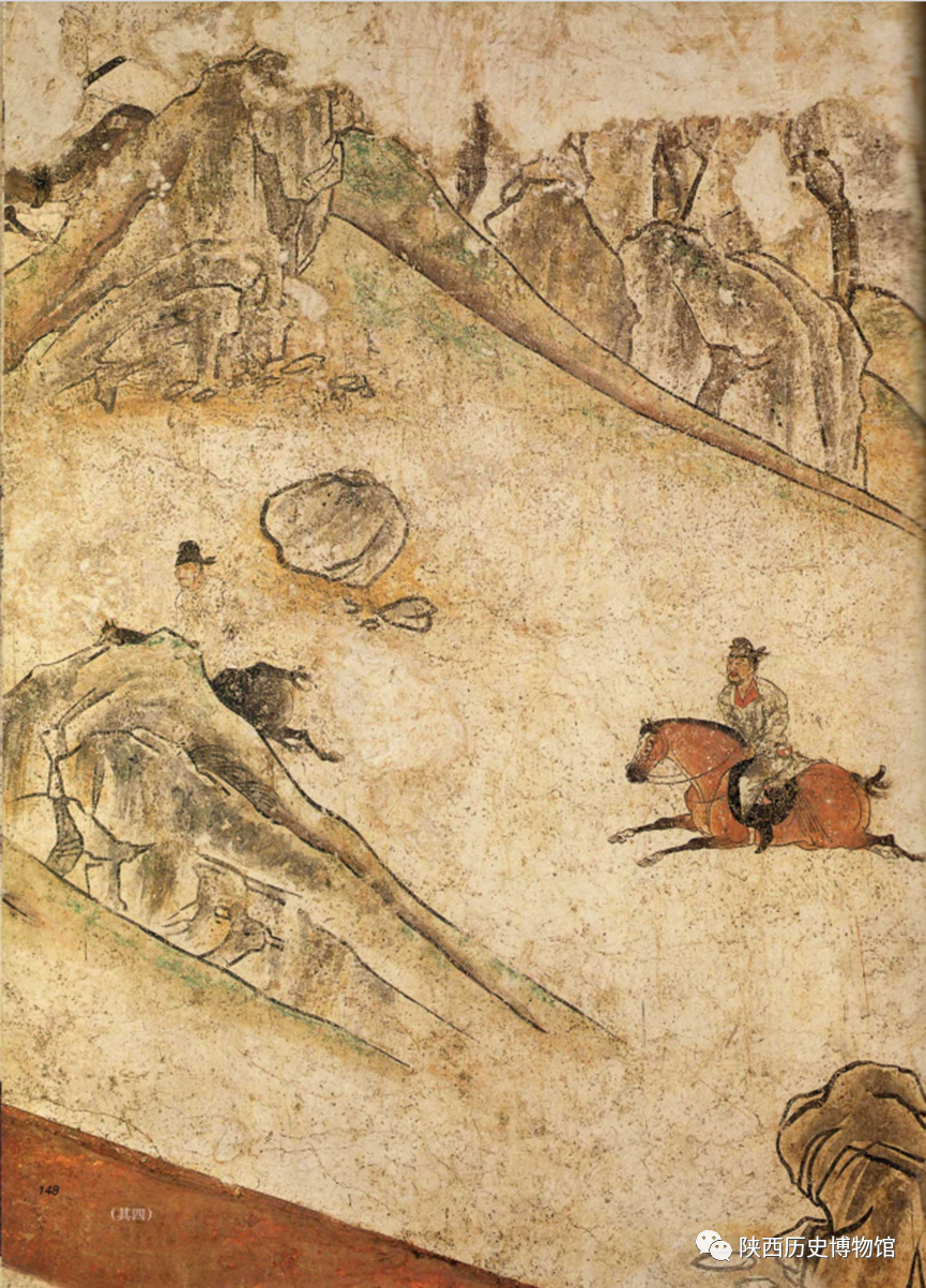 狩猎出行图高1-2米、长达8.9米。由于篇幅巨大,揭取时将其分割成了四块。图中现有人物四十六个,最前方是两名执树的探路随从,两侧是执旗卫士,最后是两匹辎重骆驼。中间一组人马共有六排,应是狩猎出行的主人皇室贵族及其随从。第一排是一位身着青衣、体态雍容的男子,坐骑是一匹披鬃垂尾的白马。从马的步伐来看,可能就是行走对侧步的走马。这种步伐的马,同侧前后蹄同时离地或着地,身体在同一水平线上作左右摆动。因此,马的鞍口平稳,没有前颠后仰之苦,是有身份的高级贵族才可享用的。据此分析,马上骑者应该就是墓主人李贤。