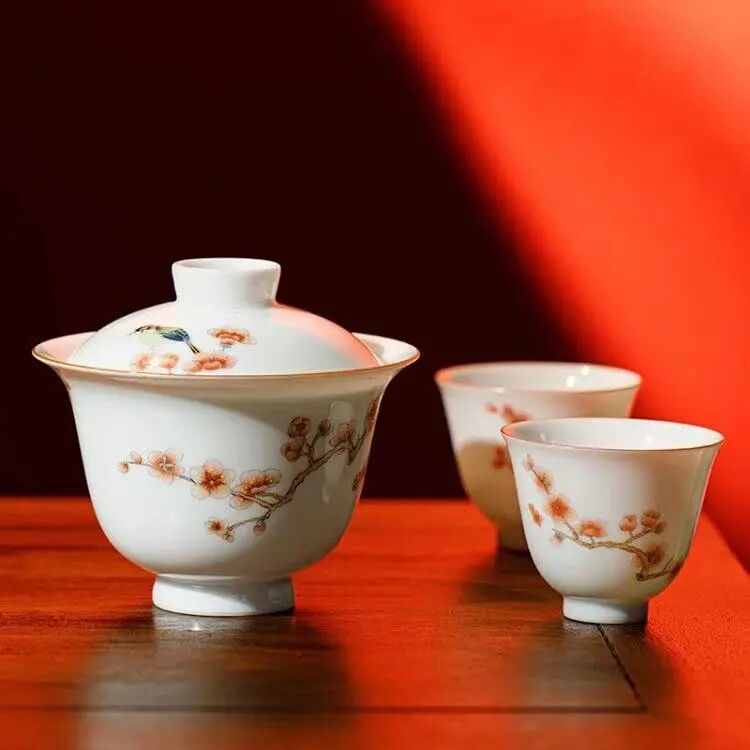 盛开的梅花横贯而出,取“疏影横斜水清浅”的诗意布局,浓淡有致,高洁清透。盖钮两侧各手工绘制一只喜鹊,踏于梅花上,与碗体梅梢呼应,和谐灵动,活泼小巧,恰若在枝桠间跳跃。一只盖碗搭配四只铃铛形茶杯,整体设色淡雅,大部分留白,突出了空灵开阔之境。