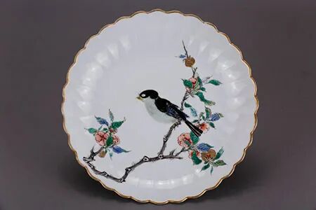 清康熙 五彩描金海棠花鸣禽图菊瓣盘