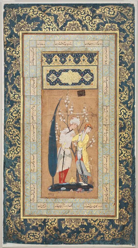 ▲苏丹·穆哈迈德《情人》,1575年,纸本水彩细密画一树春花,两个妙人,酒已斟满,半推半就。当调情变成一种情调时,乐而不淫就顺理成章地为宫廷所推崇。![]()