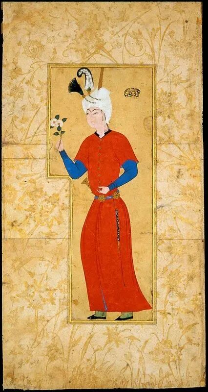 苏丹·穆哈迈德的细密画设色艳丽,曲线流畅,一改前人僵硬平直的呆板画风。例如,他的名作《情人》,富丽典雅,极具装饰效果,深得贵族喜爱。![]()