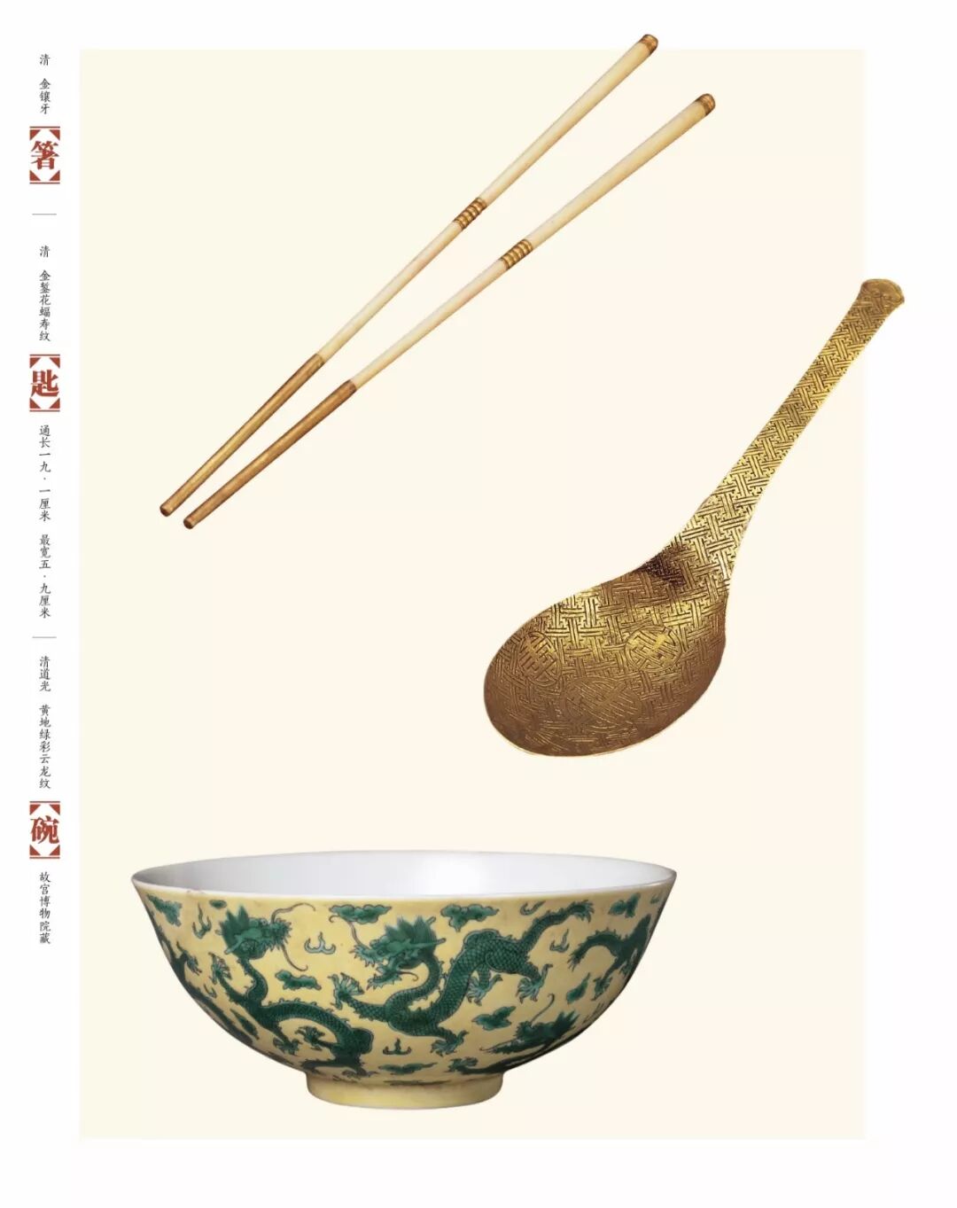 乾隆年间规范宫中各项制度,国家筵宴仪式被载入《国朝宫史》,还钦定《宫中现行则例》,将元旦、万寿、上元、中秋、冬至、除夕等节日规定为宫廷家宴、群臣宴、宗亲宴的筵宴日。除夕、元旦家宴是皇帝与后妃女眷、亲王、皇子等分别举行的团圆宴。虽为家宴,也要严格遵守礼仪程序进行。乾隆二年(一七三七年),皇帝与后妃女眷在乾清宫举行除夕家宴。家宴由内务府承办,皇帝御宴桌摆冷膳、热膳、群膳四十品,后摆酒膳、茶膳各二十品,再加上悖悖、小菜、汤、粥、蜜饯食品等一百零八品;皇后头等宴桌减少为六十四品;贵妃、妃的二等宴桌每桌两人, 嫔、贵人三等宴桌每桌三人,膳馔为三十二品。家宴所用餐具,皇帝用金龙盘、金龙碗,金勺、金箸;皇后用里外全黄暗云龙盘碗,金勺、箸;贵妃以下无金餐具,各用「位份碗」(代表等级身份的 餐具):贵妃、妃为黄地绿龙盘碗,嫔用蓝地黄龙盘碗,贵人用酱地蓝龙盘碗。