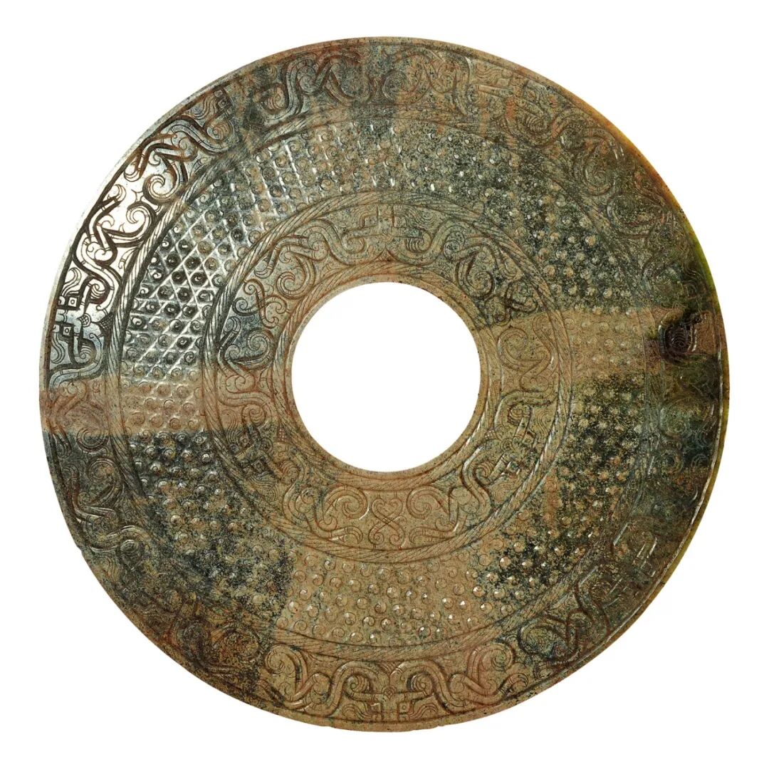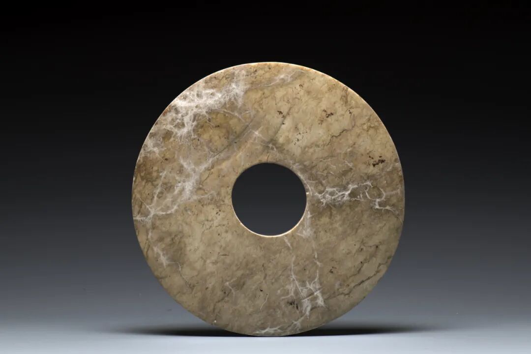 良渚文化凭借其独特性和开创性,在中华民族共同体形成过程中起到了非凡的作用。良渚文化的符号——良渚玉器,是史前玉器发展的高峰。岭南地区的多处史前遗址发现了与良渚文化器物相似乃至几乎一致的文物,其中以发现于广东省韶关市曲江区马坝镇,距今约5000—4000年的石峡遗址最多。石峡遗址出土的M43:2玉璧,属于直径小,孔径较大的类型。这类玉璧是良渚文化中期常见的玉璧风格。