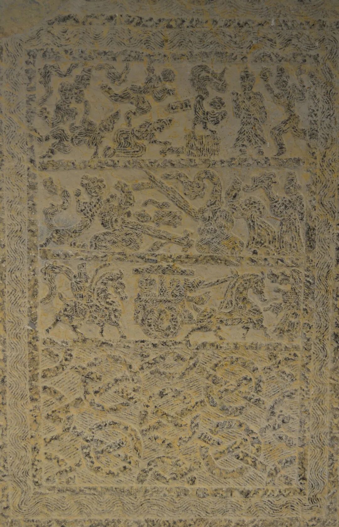 在墓主赵眜的椁的四角,都固定了一块玉璧,当时究竟是怎么固定的,我们已经没有办法看见,但是通过画像石,或许我们可以推测一二。十字穿环或二龙穿璧是汉代画像石中常见的主题,从玉璧留下的痕迹来看,也很有可能是以丝带打成十字结,固定在外椁上。