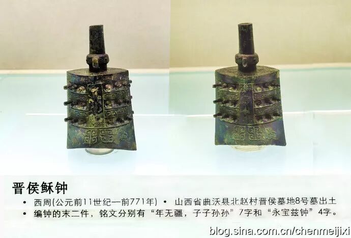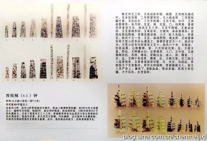 后来,1992年在山西北赵村天马----曲村晋献侯墓遗址又出土到同款编钟两枚(按规制整套一共有16枚,因此古墓曾经历盗掘,只有最小的两枚编钟幸免于难)。经专家除锈处理,发现在这套大小不一的编钟上刻凿的文字竟然可以连读。16枚编钟上355个文字,完整地记录了如下历史:周厉王三十三年,晋献侯稣率军随周王巡视东土,并受王命去征讨叛乱的少数民族部落,立功后将这套战利品刻上铭文作为受赏纪念。