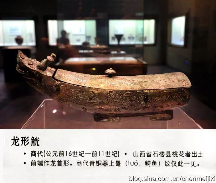 这个龙形觥本不在我的名单上,是志愿者力荐的。现场听介绍,此器高19厘米,长43厘米,宽13.4厘米,属温酒器。一边一对贯耳用于悬吊;通体呈龙形,前端为龙首,露齿昂翘,瞠目张角,龇牙咧嘴为流。盖面饰龙纹与前端龙首衔接,衬涡旋纹。腹两侧以涡纹和云纹为衬托,主纹饰鼍纹和夔龙纹,头向与龙首相反,颇富动感。圈足饰相对的夔龙纹,更增稳定之感。特别是鼍纹在青铜器中极为少见,鼍即鳄鱼。是商代晚期“方国”青铜文化的代表作品。