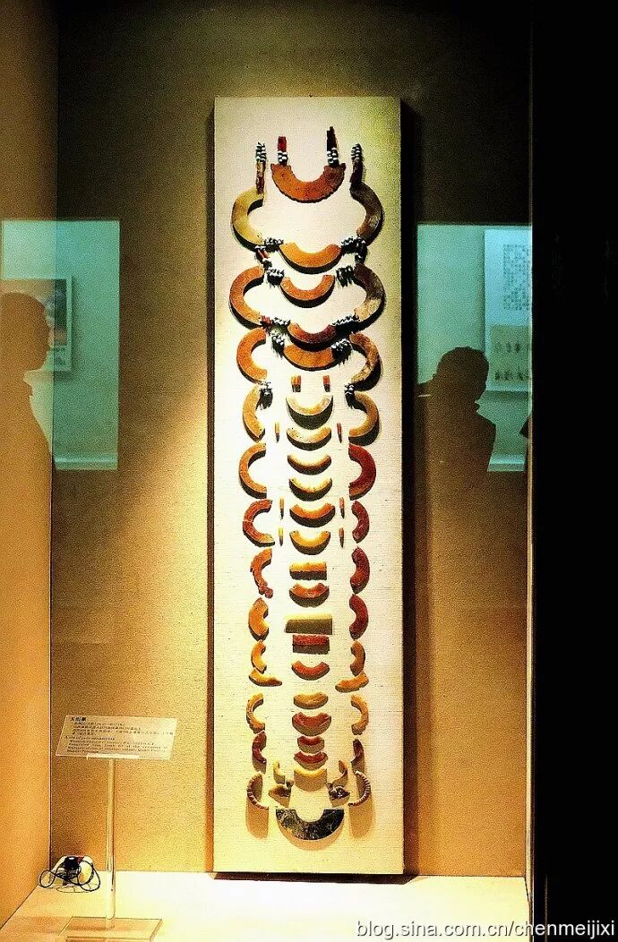长约170厘米,最大璜长15.8厘米。由玉璜、玉珩、冲牙、玉管、料珠、玛瑙管组成,共计204件,以45件玉璜为主体,是迄今见到的组佩中玉璜最多者。玉饰上的纹饰精雕细琢,有双龙纹、双首鸟纹、人龙合体纹等,其下端2件玉雁更是晶莹剔透,昂首展翅。组佩又名“杂佩”、“佩玉”,专指周秦之际盛行的由多件玉器串联组成的悬于身上的佩饰玉,是国君或高级贵族区别贵贱、等级的标志和象征。墓主人为晋穆侯次夫人。