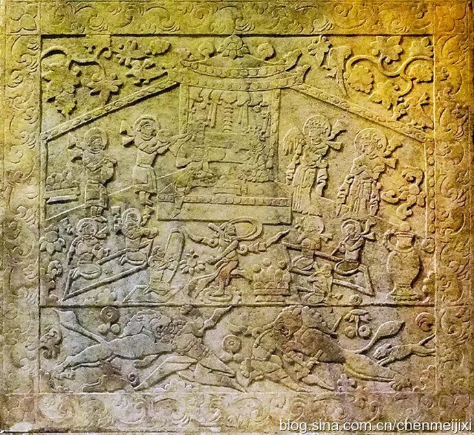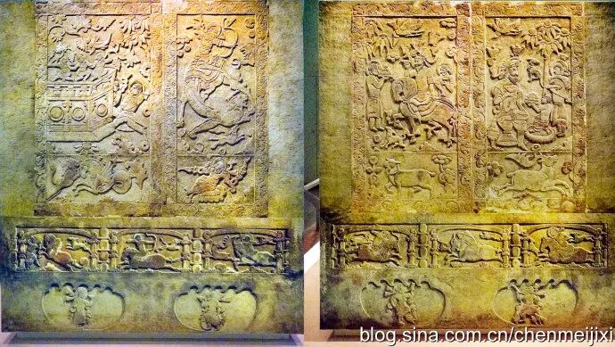 浮雕上所有的人物都是深目高鼻,竟然没有一个中土人士~其中狩猎图中,多为骑马、骑象、骑骆驼搏杀狮子者。图中的人物服饰、器皿、乐器、舞蹈以及花草树木等,均源于波斯与中亚诸国,典型的有带绶鸟、带绶马、胡腾舞。。。波斯、中亚文化色彩非常浓厚突出。比如一些马的尾巴,被编织成蝴蝶结,极具浪漫的气质,这是典型的波斯风格装饰。
