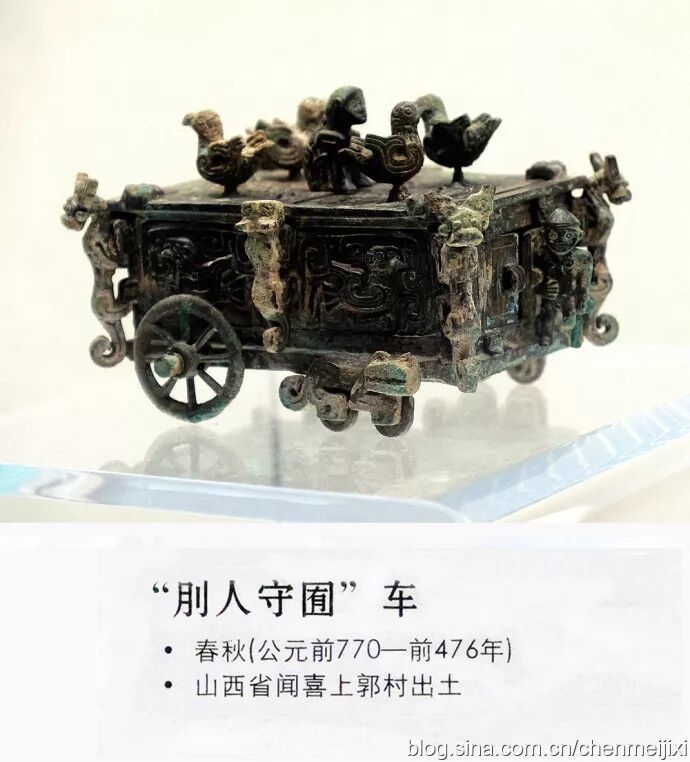 车高9.1厘米,长13.7厘米,宽11.3厘米。厢式六轮车。车顶部有双扇盖可以开启,盖面嵌有一猴形捉手,周边围绕四只振翅欲飞的小鸟,器壁饰相背的凤鸟纹,并有兽形装饰,器足由两大、四小共六个轮子组成,可挽环牵引,可用手推转动。器壁一侧有一小环,另一侧开一小门,门扉上立一受了刖刑的人,头戴尖帽,左脚残,左手持拐杖,门栓从此人的右臂腋下穿过,控制车门开闭。整个器物可转动的部位共计15处,共有猴、虎、鸟等14个动物,形象刻画了西周贵族“域养禽兽”的苑囿之景,与《周礼》“刖人使守囿”的记载相吻合。西周晚期青铜艺术精品。