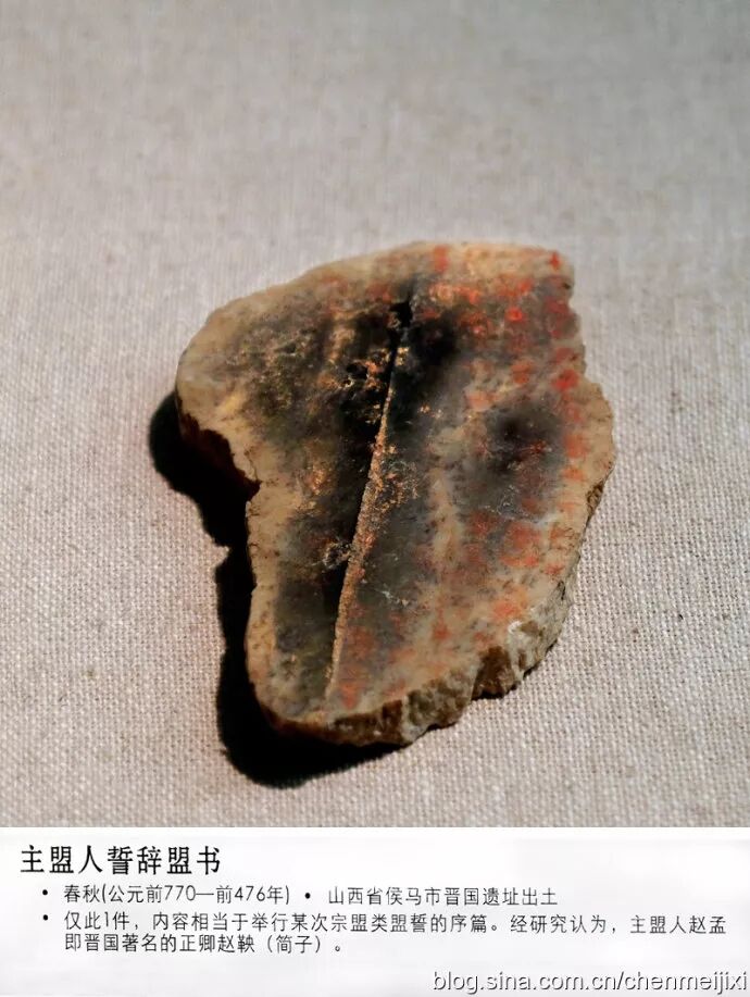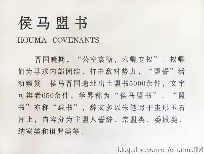 “侯马盟书”是半个世纪以来中国十项重大考古成果之一,已成为国宝级的文物。这批文物对研究中国先秦时期春秋战国之交的历史,特别是晋国末期的历史增添了新鲜材料。