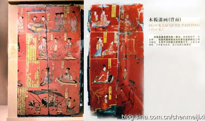 通长82厘米,宽40厘米,厚约2.5厘米。系漆画屏风中的两块,之间由榫卯连接。板面髹朱漆,分上下四层彩绘《列女传》故事,线条用黑色,人物面部和手部涂铅白,服饰器具用黄、白、青绿、橙红、灰蓝等色。题记和榜书处再涂黄漆,其上墨书文字。画风近顾恺之。题记和榜书文字介于隶、楷之间,气势疏朗,是少见的北魏墨迹。木板漆画是南北朝时期文化融合的产物,具有极高的历史和艺术价值。