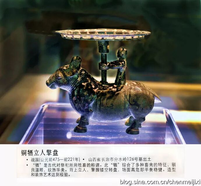 高14.5厘米,长18厘米,盘径14厘米,重1.38公斤。盘为圆形,侈口,平底,下接支柱,可以灵活转动,盘底以镂空蟠虺纹装饰。牺牲体肥硕,面部表情温顺,双目圆睁,长吻大耳,四足短而粗壮,站立平稳,牲背上站立一人,面目清秀,束发垂脊,身穿右衽长袍,双臂前伸,手握盘柱。“牺”是古代祭祀所用牲畜的称谓。该器的功能尚待进一步研究。