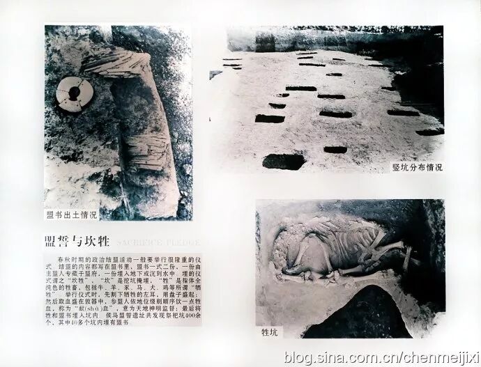 盟书一式两份,一份各自保存,另一份举行“坎牲(即把纯色牛羊等左耳割下,将血滴于酒中,加盟者按地位依次饮酒,称为“歃血”。成语“歃血为盟”即从此出)”后与牲分坑埋于地下。主持此仪式的就是赵鞅(简子)。《赵氏孤儿》中的孤儿赵武之孙。