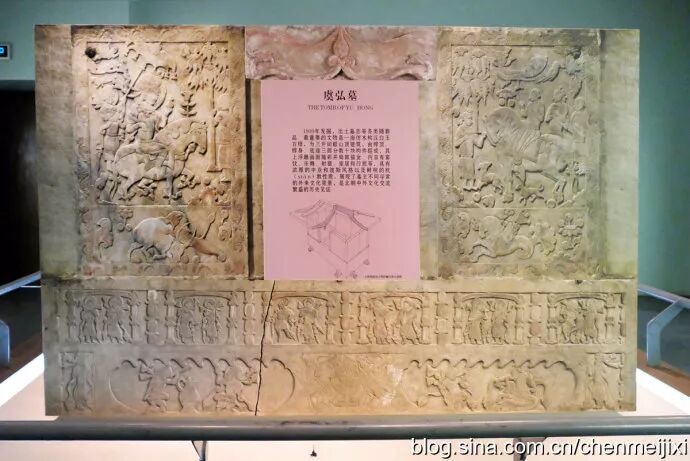 墓主人叫虞弘,中西亚的鱼国人。出使北齐时被留任,掌管入华外国人事务。59岁死于太原。这座沉睡了一千四百年的墓葬,犹如一座大型的宝库,散发出浓浓的异域风情,华丽而神秘地展现在世人的面前,成为1999年全国十大考古新发现之一。