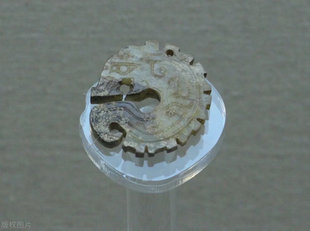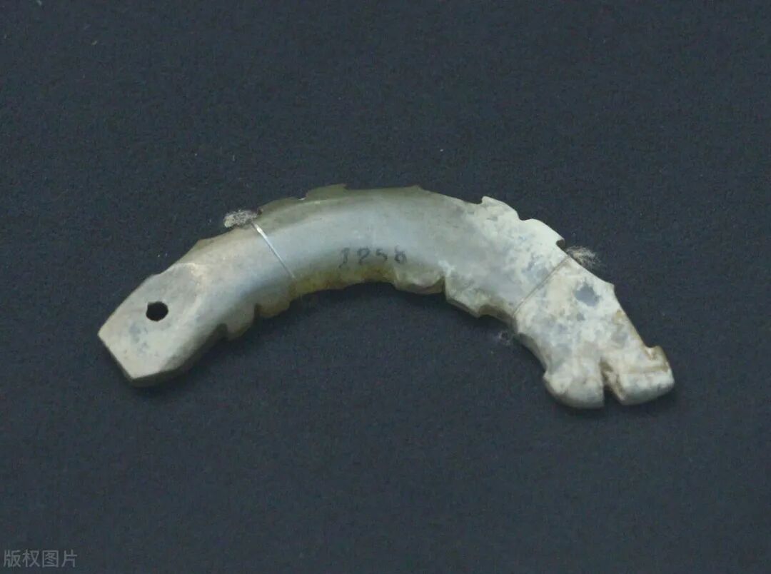 其实,玉器是否受沁,除了埋藏环境外,主要是因为玉器里所包含的杂质所致。最好的白玉,也就是含透闪石比例极高的玉器,就不容易受沁。当然,前人总结的因为埋藏环境,北方干燥不易受沁,南方潮湿容易受沁也是有道理的。刘大同《古玉辨》就有这样的说法:“玉入土者,性喜燥,不喜湿。土湿则易烂,色亦暗淡无光。南方出土之玉不多见者,皆腐烂,多不完整,而色又不足惊人故也。”图为商代龙形玉玦。也是双沟阴刻线条的。