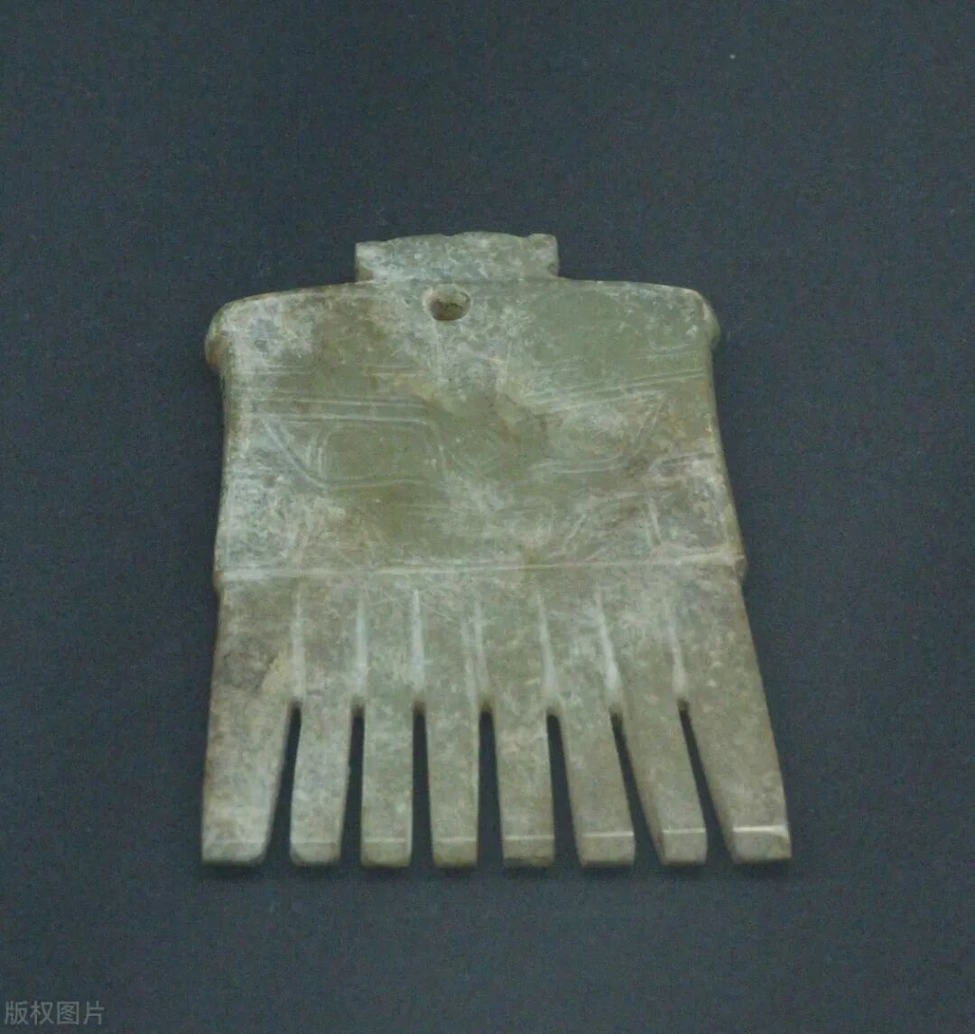 这是一件商代的玉梳子。兽面纹,眼睛是臣字眼。所谓的臣字眼,就是说此时的眼睛多雕成一个甲骨文臣的样子。注意它的沁,仅仅浮在表面,并没有深入肌骨。一般来说商代玉器都有各种沁,而西周反而有些玉器没有沁,这是为什么呢?