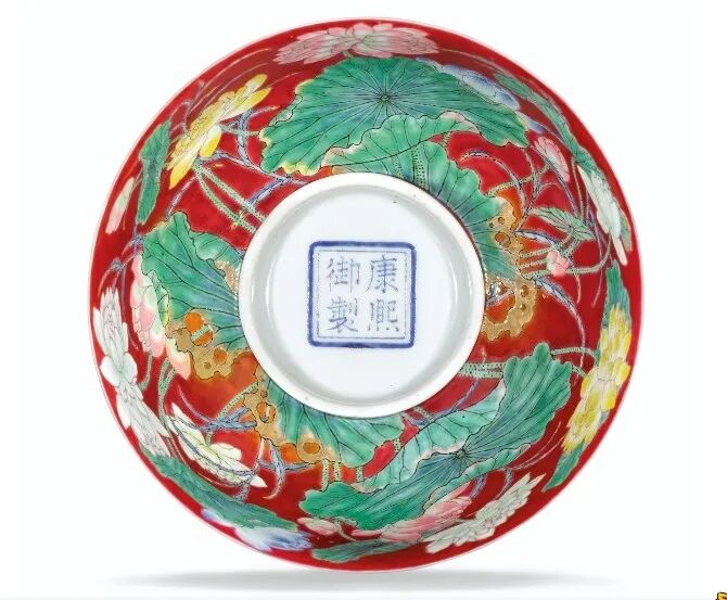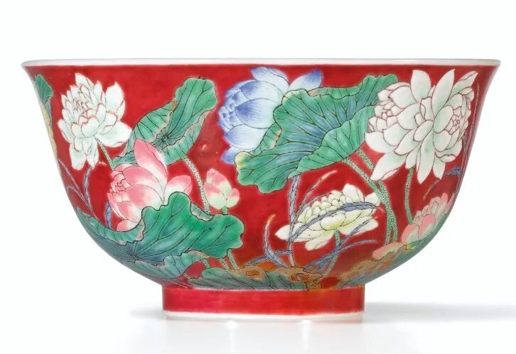 清康熙 御制胭脂红地珐琅彩莲花图碗,2013年香港苏富比以7404万港元成交。