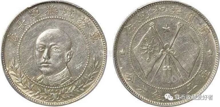 “唐继尧拥护共和纪念银币”,简称唐头或者唐正!唐军长是币界的俗称,云南省造。 正面为唐继尧正像或侧像,上铭“军务院抚军长唐”,正像币下有嘉禾,侧像币则无。因从左至右读为唐军长比较顺口,于是这个称谓一直流传下来。背面正中为交叉的双旗(五色旗和十八星旗),上铭“拥护共和纪念”,下面是三钱六分记重面值(即5角)。