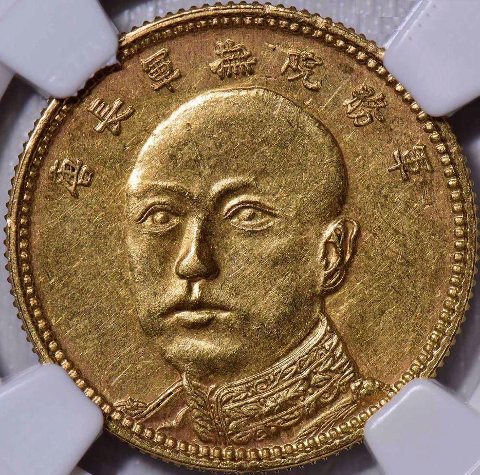 唐继尧纪念币铸造于护国运动的首发地——云南,是波澜壮阔的讨袁护国运动的历史见证物。1915年12月,蔡锷与云南都督唐继尧及李烈钧、方声涛等反对袁世凯称帝,拥护共和政体,组织护国军讨伐袁世凯。 1916年3月22日,袁世凯在内外交困中宣布取消帝制,护国运动取得胜利。为了纪念护国运动,云南省铸造发行了有护国元勋唐继尧头像图案的纪念币。 唐继尧纪念币有金、银、铜三种材质。其中纪念金币正面为唐继尧头像图案,上书“军务院抚军长唐”;背面为交叉的九角十八星旗和五色旗图案,上书“拥护共和纪念金币”,下书“当银币伍(拾)圆”字样。金币有伍圆、 拾圆两种面值,伍圆币直径19毫米,重4.5克;拾圆币直径24毫米,重8.5克,两者发行量都只有数百枚,均极为罕见。