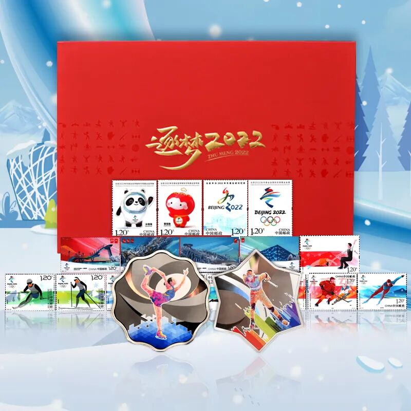 背面图案分别用英文和中文展现出滑雪和花样滑冰运动;也十分具有动感!这套《逐梦2022》采用正红色简约典雅包装,十分喜庆;封装纪念章和邮票是分开包装的哟,能够更好的保证品相。