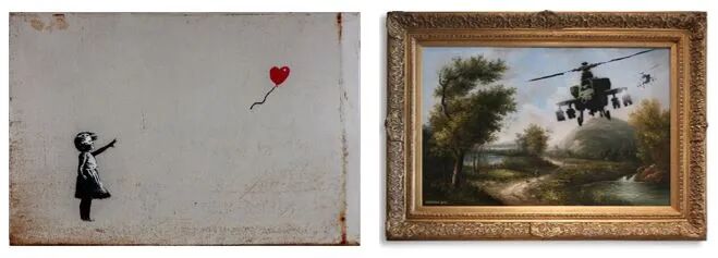 左至右:班克斯,《女孩与气球》,估价 200万-300万英镑;《恶搞油画(直升机)》,估价250万-350万英镑