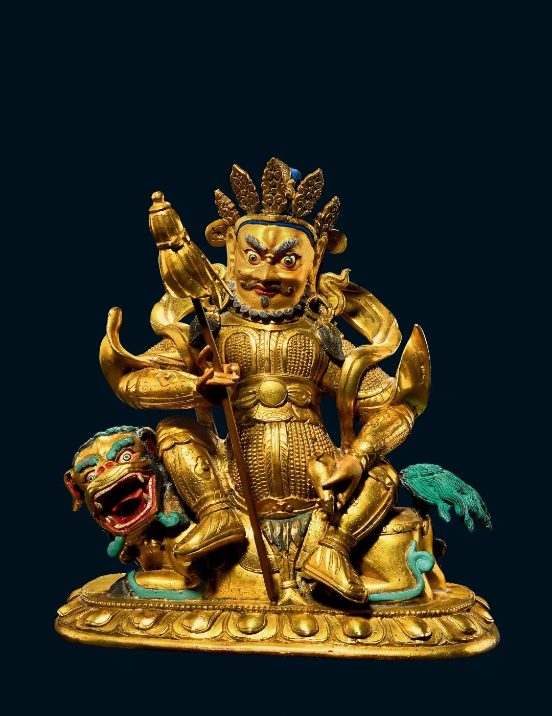 此尊财宝天王头戴宝冠,眉头微蹙,嗔目远眺。左手握吐宝鼠,象征财源滚滚,随时准备布施人间,右手持宝幢,手型饱满有力,形态逼真。天王作武将装束,身着铠甲,穿蒙古式长靴,坐于狮背上,右腿上屈,呈现威震三界的坐姿。身上的铠甲装束均作细致的描绘,纹饰精巧匀称,工艺精湛。座下之狮昂头回首,作怒吼状,四蹄和尾部壮硕。狮卧莲座。整像以精炼的黄铜铸造,工艺考究,天王与狮子的神态表现生动传神,天衣飘扬,仿若从天而降,加之镀金璀璨耀眼,使造像无不彰显皇家风范,恰如其分地表现出天王的威武与富贵,为清代融合了汉、藏、蒙地区艺术风格的一件精品。