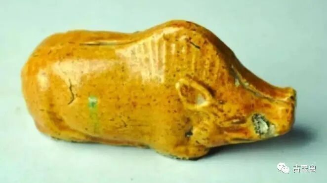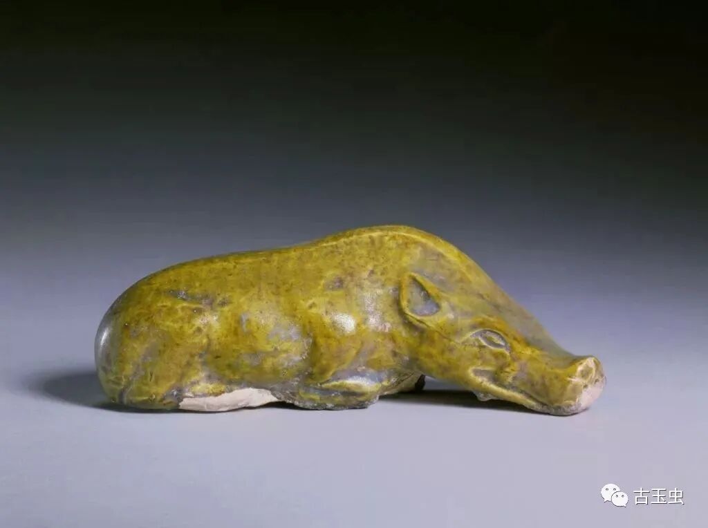 ▲隋,深黄釉卧猪,长13.2cm、宽4.5cm、高4.5cm,故宫博物院藏