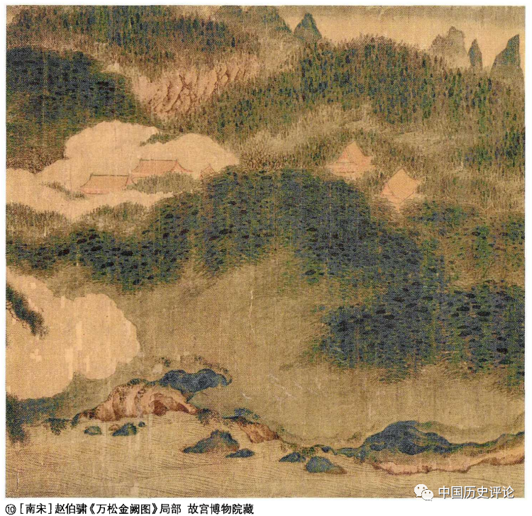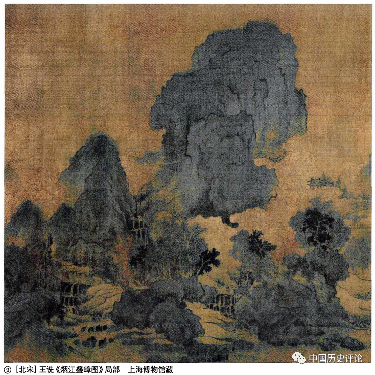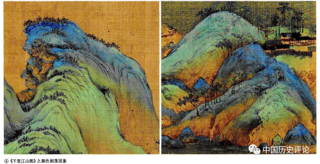 相对于晚唐以来迅速发展并占据主流的水墨山水而言,青绿山水在北宋后期是颇具古意的一种画法。青绿山水应是唐代正式形成的,以唐宗室李思训、李昭道父子(二李)创立金碧山水之体完成山水画变革为标志。《宣和画谱》记徽宗御府藏李思训山水17幅,并称“今人所画着色山水,往往多宗之(李思训),然至其妙处,不可到也”。说明宋代青绿山水多是取法李思训的,青绿山水的古意主要应指的是唐人古意。北宋后期青绿山水的复兴,既要继承唐人的古意传统,又要面临今人山水画流行水墨皴染和融入士人趣味的新趋势。《画继·王诜传》说“其画山水学李成皴法,以金碌为之,似古”,碌即碌青,是说以泥金、碌青等青绿颜料代替李成皴法,似有古意。《图绘宝鉴·王诜传》称其“又作着色山水,师唐李将军,不古不今,自成一家”,“古”指的是王诜师法李思训的青绿山水,有古意,“今”指的是王诜并非简单照搬李思训的青绿设色法,而是以李成的水墨皴法来改造之,因此是“不古不今”。此外,南宋周必大《和州防御使赠少师赵公伯骕神道碑》称赵伯骕“长于歌诗心画,取法晋唐”,指的就是其青绿山水吸取了魏晋南北朝至唐代着色山水(主要是唐代形成的青绿山水)画法的特点,有晋唐古意。从王诜《烟江叠嶂图》、赵令穰《湖庄清夏图》、赵伯骕《万松金阙图》的实例来看,都是将源自二李的青绿画法和董巨、二米、李成的水墨皴染融合起来,既有贵族装饰趣味,又有士人趣味,可以说是古今相融,抑或是不古不今,当然其中还是以色墨融合的探索和士人趣味为主。从青绿画法的特点来看,《千里江山图》体现了对唐人古意的追求,以及融合水墨皴染和士人趣味的努力。同时与王诜、赵令穰、赵伯骕等重视水墨和士人趣味的贵族绘画相比,《千里江山图》更为明确地体现了宫廷青绿山水的特点:重视精工细腻的笔法和职业绘画的精神。《千里江山图》中石青、石绿是主色调,主要用来敷染山头和山体;赭石、墨是次要的颜色,用来皴染山脚和阴面。图中矿物质的石青、石绿纯度很高,有的地方石青有剥落现象(图8),露出底层的石绿色或淡石青色,可知原来是在石绿、淡石青色的基础上再涂石青色,并且石青、石绿的颜色都比较厚重。![]()