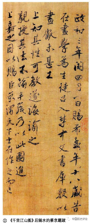 《千里江山图》本幅无画家款印,现在学界对该图作者及相关问题的认识,主要来自后隔水蔡京的题跋(图2):政和三年(1113年)闰四月一日赐,希孟年十八岁,昔在画学为生徒,召入禁中文书库。数以画献,未甚工。上知其性可教,遂诲谕之,亲授其法,不逾半岁,乃以此图进。上嘉之,因以赐臣京,谓天下士在作之而已。跋文提到该图系希孟绘,希孟曾在画学为生徒,后被召入禁中文书库,希孟数次献画但徽宗以为未甚工。徽宗知道其性可教,遂亲自教诲,希孟不到半年再以此图进,徽宗十分赞赏,于政和三年闰四月一日将此图赐蔡京,此时希孟年方18岁(对于“希孟年十八岁”究竟是徽宗赐画时还是他“昔在画学为生徒”的年纪,有不同的理解,这里蔡京特意强调,笔者认为应该是徽宗赐画时的年纪更为合理)。徽宗亲自指授不到半年即以此图进,从该画复杂、精细的程度来看,画完至少也需要半年。画应是完成后不久即赐给蔡京,那么,希孟创作该图的时间应该是在十七八岁。