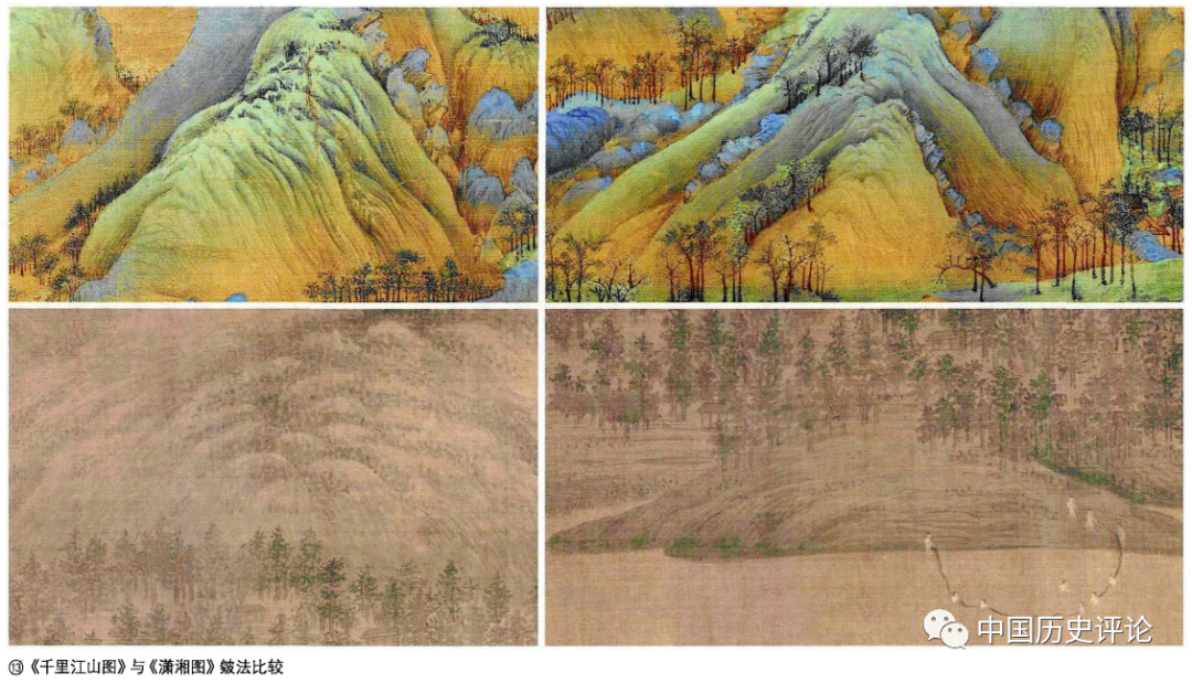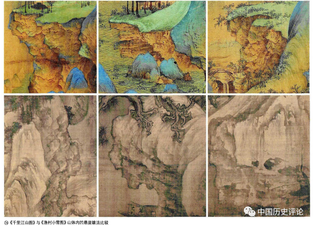 《千里江山图》中墨笔勾皴的类型和方式是十分丰富和多样化的,体现了融合董源、李成、王诜等多家水墨皴染的特点。该图山体以尖圆山峦为主,有的用平行排列的线条皴染,与董源《潇湘图》卷(图12)的披麻皴有相似之处(图13)。《千里江山图》水墨皴染更多地集中在山脚和山体阴面,其中短粗侧笔皴染的方式和王诜《渔村小雪图》卷(故宫博物院藏)十分相似。以山体内凹的悬崖为例(图14),两图均突出方石嶙峋的结构,以粗短的侧笔蘸淡墨刷染,只不过《千里江山图》多出一些类似泥里拔钉的短点子,《渔村小雪图》则注重将笔触隐藏在水墨刷染中。![]()
