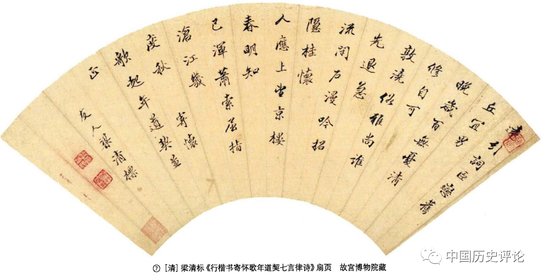 其中王济之提到希孟姓王,“真定相国”即清初鉴藏家梁清标,王济之是在梁清标家看到《千里江山图》的。顾复由此想到徽宗题款的“高古绝伦”的绘画,必定是有像王希孟这样的高手代为捉刀润色,并非日理万机的徽宗所能办到。肖燕翼在“千里江山研讨会”的发言中曾提出一个假设,《千里江山图》或可能是经王济之手卖给梁清标的。王济之是清初古董商,《平生壮观》对其倒卖书画多有记录,南宋李嵩《钱塘观潮图》卷(故宫博物院藏)本幅左下“王济之赏鉴过真迹”应为其鉴藏印。大约同时期的宋荦亦曾提及希孟姓王,他的《论画绝句二十六首》(简称《论画绝句》)之一曰:宣和供奉王希孟,天子亲传笔法精。进得一图身便死,空教肠断太师京。希孟天姿高妙,得徽宗秘传,经年作设色山水一卷进御,未几死,年二十余,其遗迹只此耳,徽宗以赐蔡京。京跋云:希孟亲得上笔法,故其画之佳如此,天下事岂不在乎上之作之哉?今希孟已死,上以兹卷赐太师臣京,展阅深为悼惜云。(见宋荦《西陂类稿》)关于宋荦《论画绝句二十六首》写作的年代,谢巍在《中国画学著作考录》中认为当撰于康熙三十二年至三十三年(1693—1694年)之间。从《论画绝句》的语气看,宋荦写诗并非看画时所写,而应是事后追忆。宋荦和梁清标关系密切,自称“自官郎署来,更奉教梁真定棠村(梁清标)先生”(见宋荦《漫堂年谱》),宋荦对梁清标的鉴定水平评价很高,称“昭代鉴赏谁第一,棠村已殁推江村(高士奇)”(见宋荦《高江村詹事舟过吴阊得纵观所藏书画临别以董文敏<江山秋霁>卷见赠作歌纪事录卷尾》,载于《西陂类稿》)。宋荦应是在梁清标家看过《千里江山图》,对比原图中的蔡京跋和宋荦的记载,可知宋荦转录得并不十分准确,比如说徽宗赐画时所说的“天下士在作之而已”就被误录为“天下事岂不在乎上之作之哉”,意思完全变了,另外蔡京跋中也没有提到希孟在进该图后“未几死,年二十余”,这大概是宋荦和梁清标等看画时的议论和推测。至于王济之、宋荦等如何知晓希孟姓王,已无从得知,一种可靠的推测是画上原有题签之类的信息,该信息在后来重裱时消失。杨新《关于<干里江山图>》中提到该图“清初为梁清标所得,他自题了外签”“清初梁清标的标签上和宋荦的《论画绝句》中才提到希孟姓‘王’”,似乎是指现存题签是梁清标所书。《千里江山图》现在的外签行楷书题“王希孟千里江山图”(图6),通过与梁清标《楷书送东谷老年台归里七言诗》扇页(顺治十八年,1661年)《行楷书寄怀歌年道契七言律诗》扇页(图7)《行书为在中亲家七言律诗》轴(以上均藏于故宫博物院)笔迹比对,笔者认为现存题签并非梁清标所书,现存题签年代应更晚。王济之、宋荦之后,乾隆内府编撰的《石渠宝笈》也沿袭了王希孟的称呼,希孟姓王的说法从而得到更为广泛的传播而被普遍接受。至于希孟是否姓王,笔者倾向于认为王济之、宋荦应是有所依据的。即使退一步讲,王济之、宋荦的依据是有问题的,根据蔡京题跋径直称呼其为希孟也是可以的。在没有确切证据的情况下,不必执着于希孟是否姓王的问题,更不能因为拿不出确切的证据来证明希孟姓王而否认希孟之存在。![]()