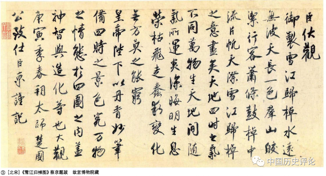 从青绿山水的演变序列和时代风格上看,《千里江山图》符合北宋后期追求古意、色墨融合的“不古不今”的特点。同时与《烟江叠嶂图》《湖庄清夏图》相比,《千里江山图》更具有唐人古意,突出了精工的风格形式和装饰性的趣味,体现了宫廷绘画所追求的职业精神。笔者认为,《千里江山图》所体现的青绿设色的特点和笔墨风格,与蔡京跋中称其为徽宗时期的宫廷绘画是完全契合的,因此蔡京跋中的内容是完全可信的。