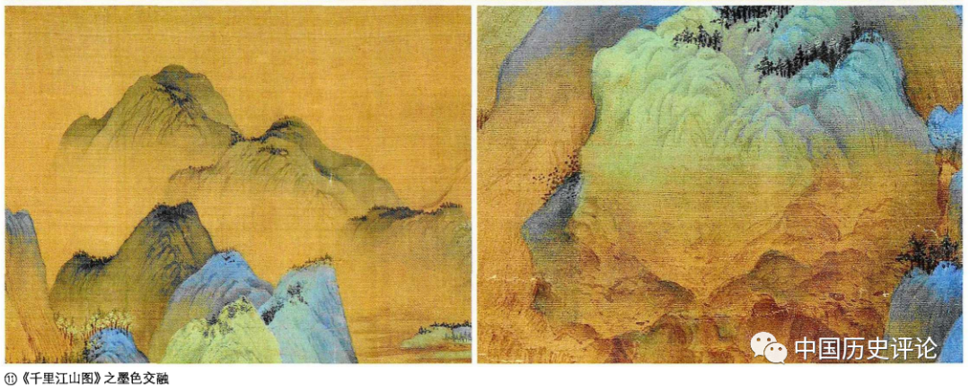 区分大、小青绿的标准主要看用色时所掺水墨的比例。《千里江山图》中,近、中景的山顶和阳面石青、石绿纯度很高,有的几乎用的是纯色,在过渡部分及阴面掺少量水墨,只在山脚、最阴面及远山掺六七分或更多的淡墨,整体看起来青绿颜色十分亮丽。用高纯度不掺或少掺水墨的石青石绿赋色普遍见于唐代的山水画,这在敦煌山水壁画中有充分体现,以盛唐莫高窟第217窟、103窟南壁青绿山水背景最为典型,究其主因是水墨山水在晚唐才开始兴起,在此之前青绿山水还没有色墨融合的条件。被认为“殆始开青绿之源”的《游春图》反映了初盛唐时期青绿山水画的风格,现存画面上石青、石绿颜料磨损、脱落严重,但是颜料纯度很高,没有或极少掺水墨,之前应是很鲜丽的。《千里江山图》以亮丽的青绿赋色为主,另外也有淡墨和青绿、淡赭色的融合(图11)。图中近、中景山头和阳面以明亮的青绿赋色为主,山脚和阴面则运用了大量淡墨融合颜色的皴染:通常是山脚略施淡赭色,其上以松软、细小的淡墨侧笔皴染,墨线较短,顺着山体结构排列,同时侧笔刷染也时而形成小面积的淡墨块。水墨和石青、石绿,以及石青和石绿之间是有丰富过渡层次的,故而全画颜色鲜丽但并不突兀。远山及天空上部,用淡青绿颜色蘸淡墨刷染而成,或三分色七分墨,或七分色三分墨,既拉开了与近中景山峰在视觉空间上的距离,也衬托了近中景山峰颜色明亮的程度。