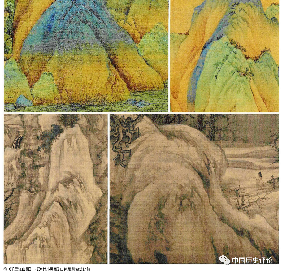 再以山脚处用短侧笔皴染的中小山石为例(图15),或皴染出卷云状的体积感,或塑造成三角体叠加上升的态势,两图在局部形象之塑造上较为相似。大胆地设想,如果《千里江山图》去掉颜色,会是一幅与《渔村小雪图》风格相似的雪景水墨山水;如果将《渔村小雪图》表示披雪的留白和白粉部分涂石青石绿色,亦能变成一幅与《千里江山图》风格近似的青绿山水。