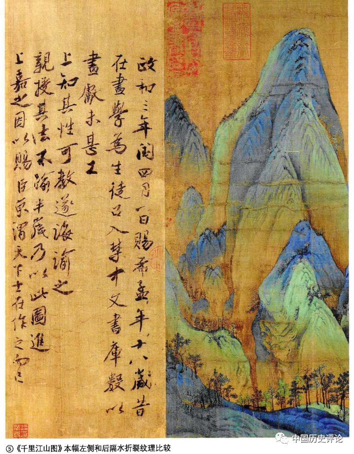 《千里江山图》中石青石绿的颜色历经900多年仍然鲜丽如新而不褪色,并且亮丽清雅而不俗艳,另笔者在故宫摄影室为该图照相时,偶然发现灯光变暗时石青、石绿会发出淡淡的荧光,这些都表明希孟用的是极为优质的颜料。这与蔡京跋中提到徽宗指授的情况是相符的,徽宗宫廷为希孟绘制该图提供了优质的颜料,其后乾隆朝宫廷画家王炳、方琮临仿《千里江山图》时所用的颜料明显就不如原图。