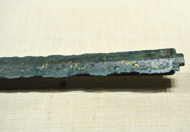 镶嵌珍珠、绿宋石和玉璜的镀金带钩 战国时期 长16.5cm