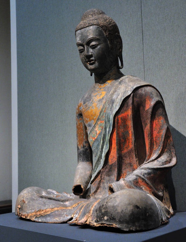 这尊佛像有近1400年的历史,为7世纪初唐朝干漆夹纻工艺制作的坐佛。造像生动细腻,宛若真人,双目有神,表情祥和,呈跏趺坐姿,身披袈裟,袒右肩,衣纹褶皱自然写实,流畅生动,袒露的胸部肌肉平滑光洁,充满弹性。袈裟表面均残留敷彩痕迹,佛像裸露的肌肤处可见较为明显的贴金痕迹,袈裟表面残留鲜艳的红,蓝敷色。大都会的签注上标注佛像来自直隶省正定大佛寺。
