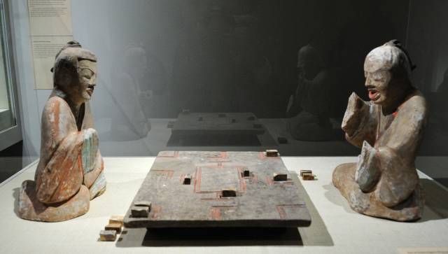 六博在汉代流行。出土汉俑即有二人对坐六博者。鲍宏《博经》:『用十二棋,六棋白,六棋黑,所掷头,谓之琼。』每人六棋,局分十二道,中间横一空间为水,放鱼两枚。博时先掷采,后行棋。棋到水处则食鱼,食一鱼得二筹。更多具体玩法,已失传。