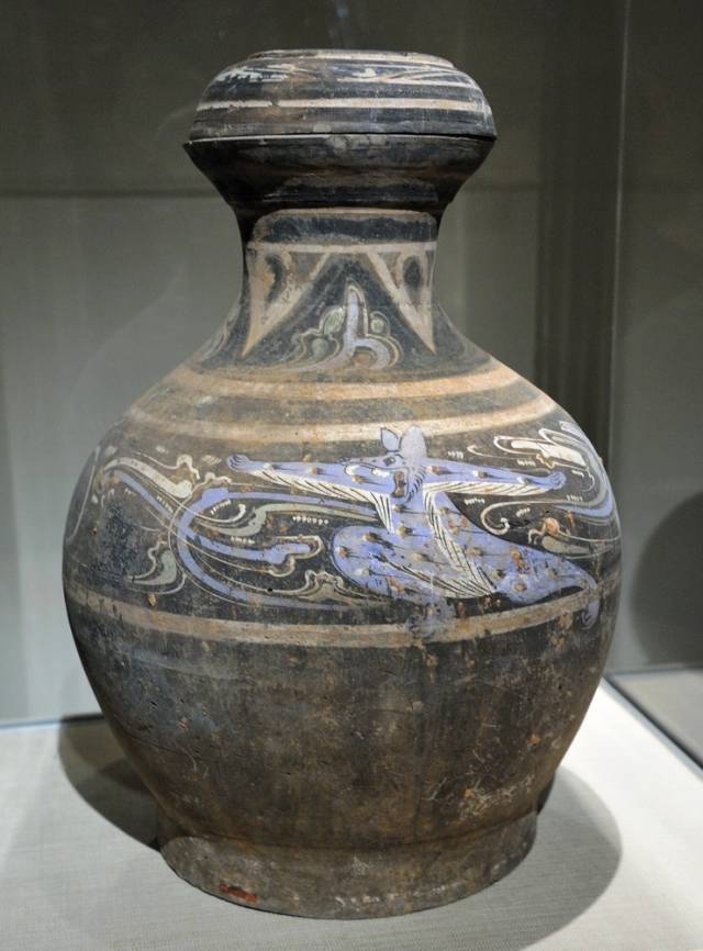 这尊彩绘陶壶,其绚丽的彩色颜料使用和自信奔放、挥洒自如的黑色笔触而达成完美的装饰效果展现了西汉时代个性张扬的一面