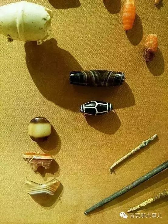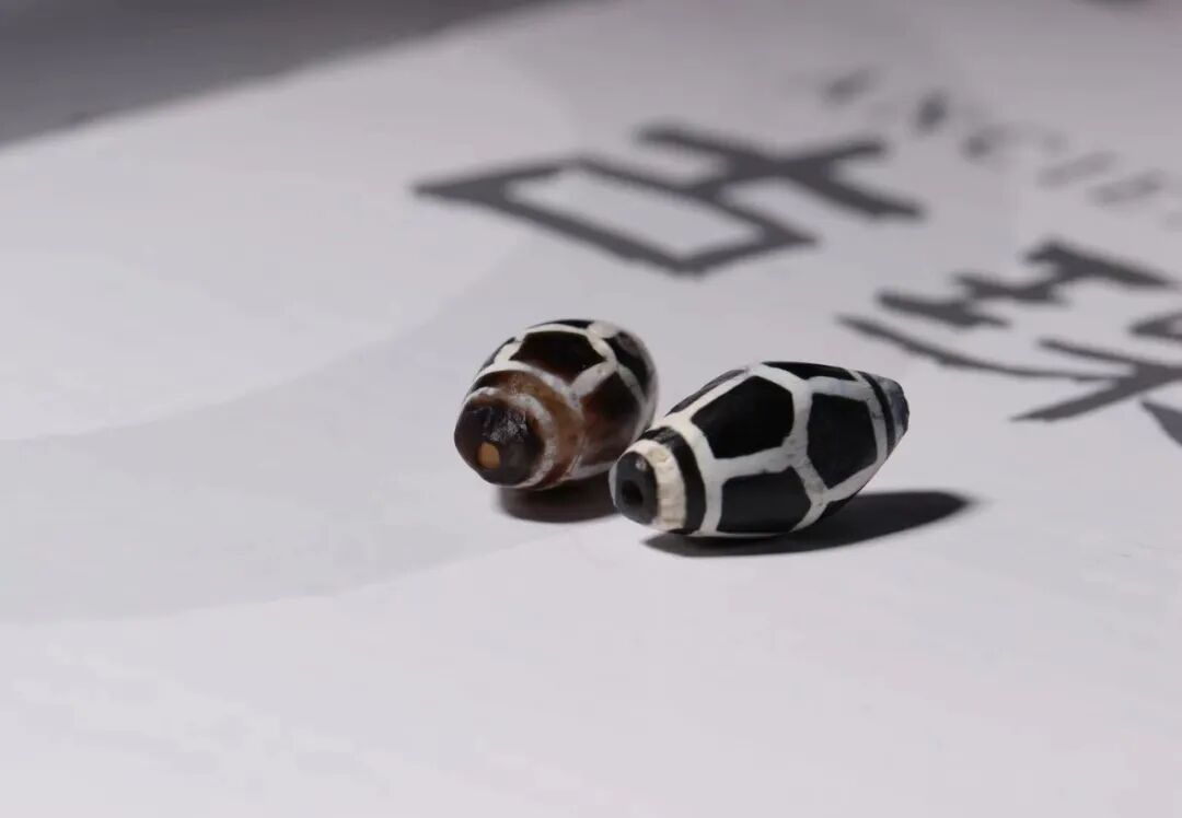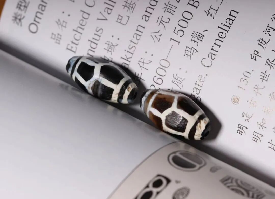 “寿珠”是很后来的名字。回到最初,公元前两三百年,我们这里正是激越绚烂的春秋战国时期。那时,印度河谷的先民制作出一种特殊的珠子。他们先将玛瑙珠蚀化成黑色或深色,再涂上网格状的白线,通过加热等程序,定形为带有一定图案的珠子。