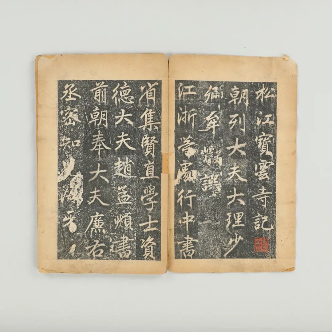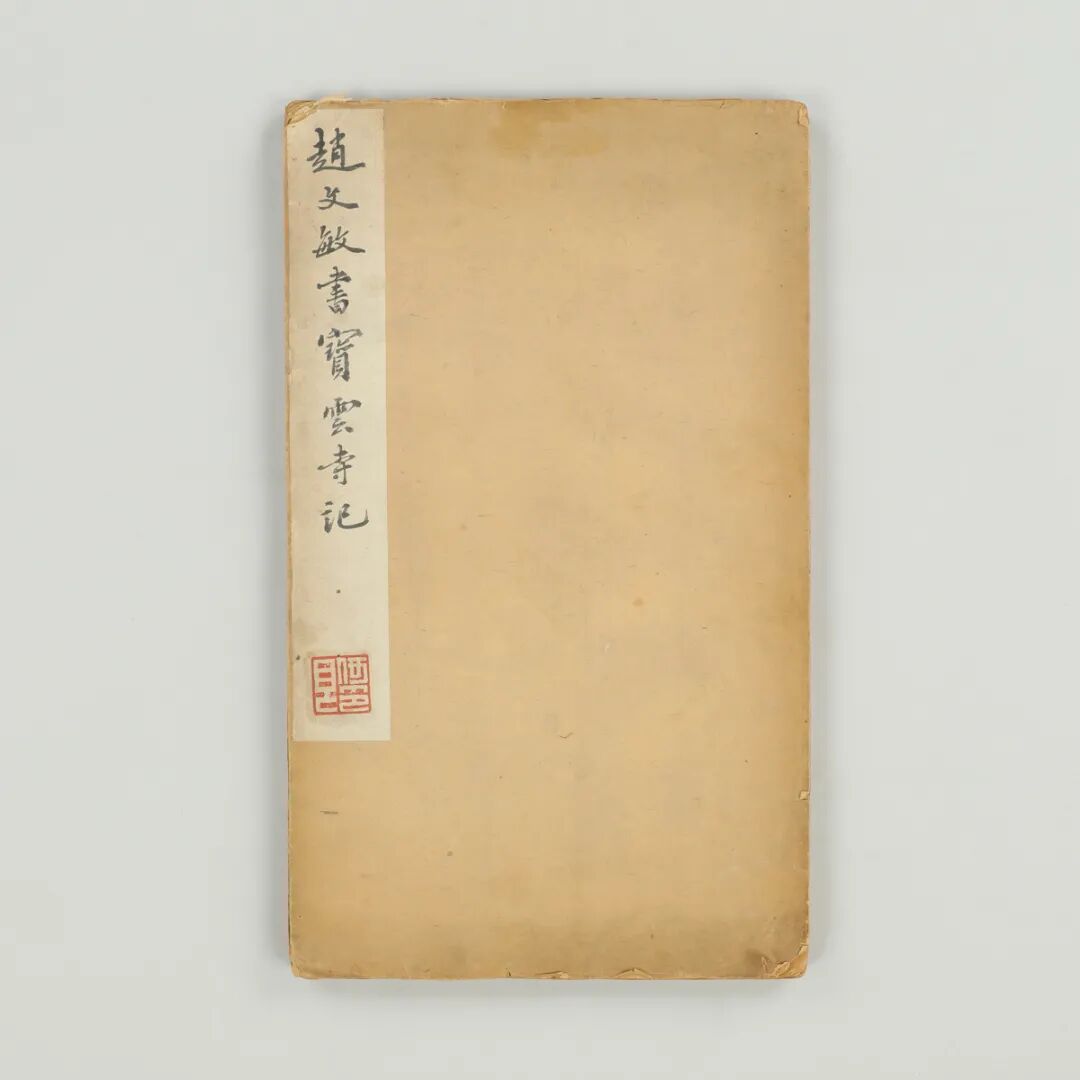 松江宝云寺建成于唐大中十三年(859),位于今上海市金山区亭林镇(原属松江县)。相传“宝云寺”曾有1048间,梵宇轩昂,绵延数华里,号称“江南名刹之五,华亭之最”。由于饱经自然灾害及战火沧桑,“宝云寺”屡修屡毁。元代重修时住持净月立碑,牟巘撰文,廉密知儿海牙(汉名廉恂)篆额“重修宝云寺记”,碑文由赵孟頫书,当地人均将此碑称“子昂碑”。此拍品封面有墨笔题签:“赵文敏书宝云寺记”,剪裱成册,无碑额。