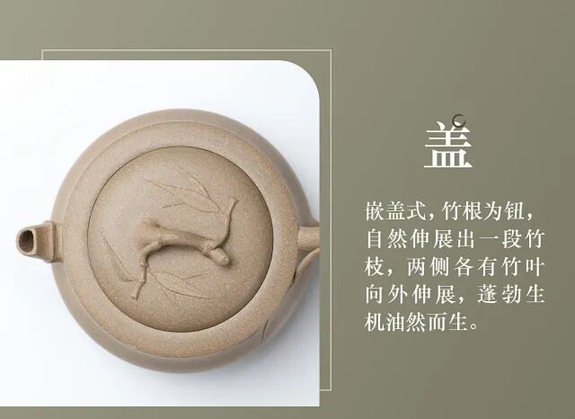 壶盖为嵌盖式,竹根为钮,自然伸展出一段竹枝,两侧竹叶向外延伸肆意生长,蓬勃生机似竹节破土,盎然而出。