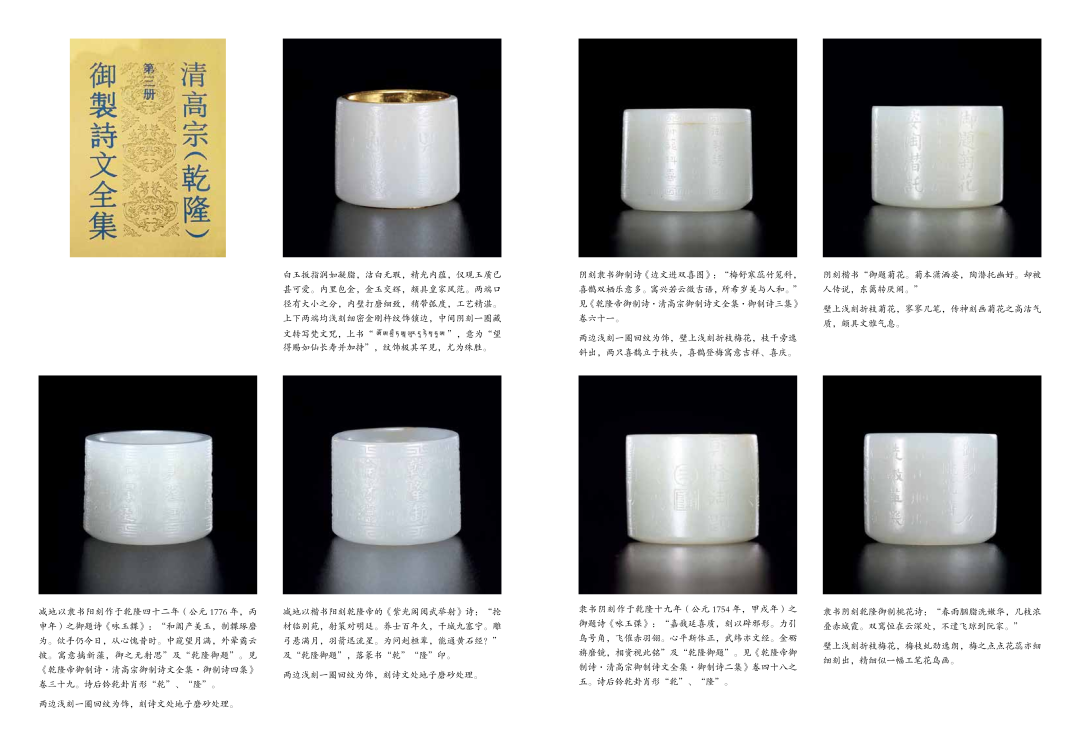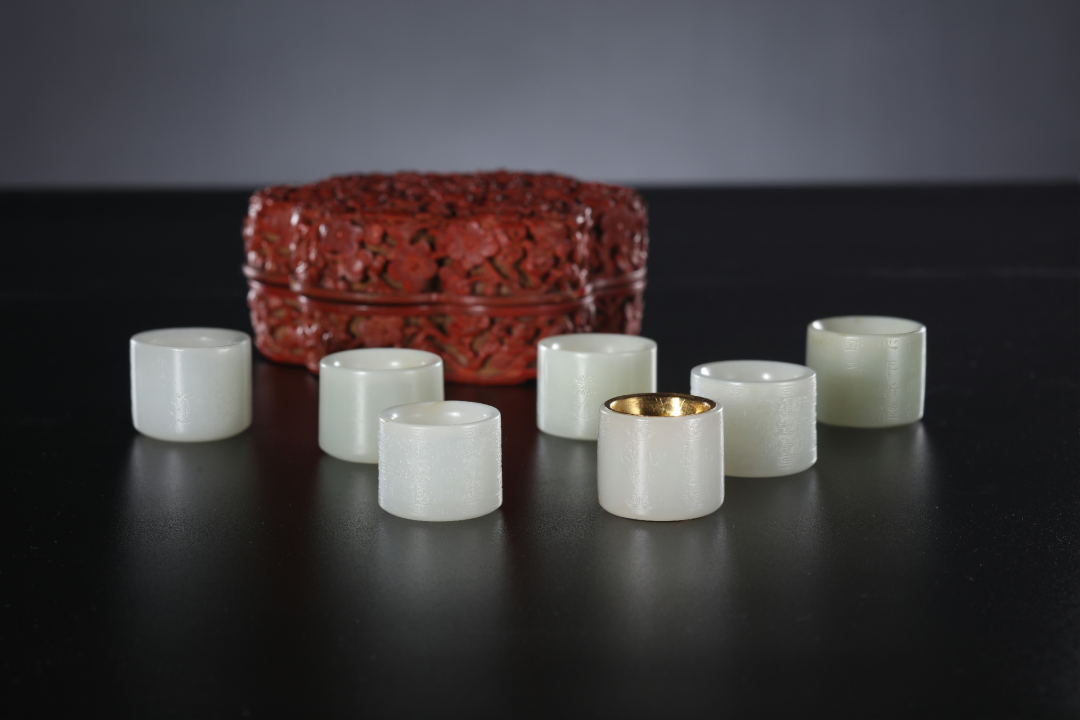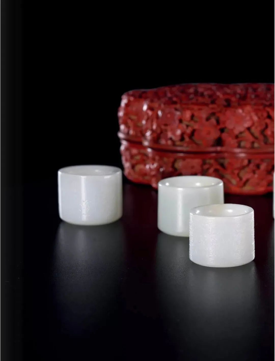 此件拍品一组 7 件扳指均以羊脂白玉打磨雕制而成,玉质细腻温润,包浆清透,内壁光滑,器型规整呈圆柱体, 外壁精刻御制诗及花纹,字体工整雅致,制式符合清宫造办处的档案记载。清帝乾隆尤爱扳指,据统计他为诸多玉扳指写作御制诗不下五十首。今北京故宫博物院所藏《乾隆大阅图》中,即可见到乾隆帝右手拇指上佩一白玉扳指。