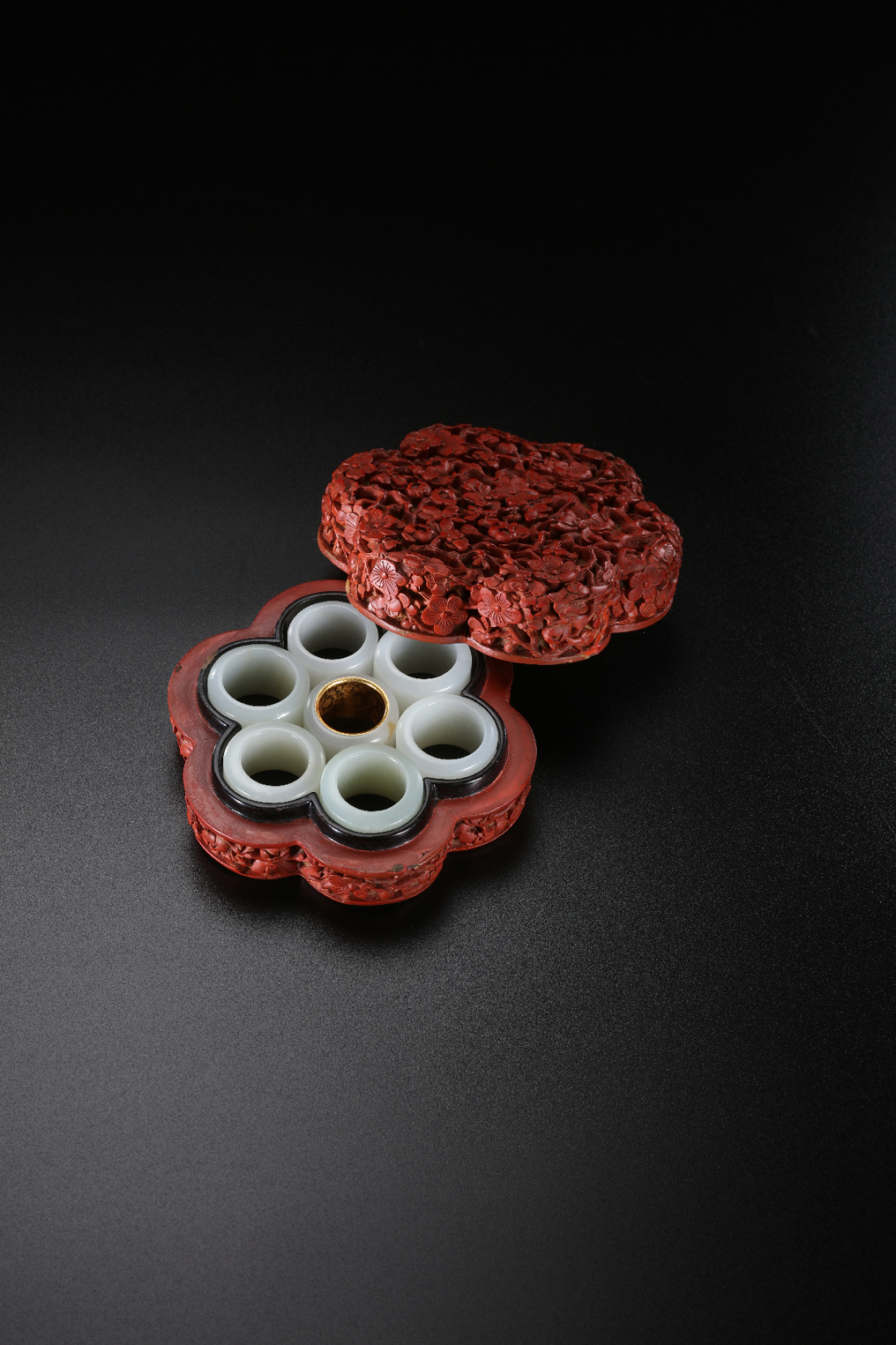 本拍品原配剔红花形漆盒,每件扳指置于其中皆自得其位,严丝合缝。剔红盒漆色沉稳,漆层浑厚,通体于锦地回纹之上满雕缠枝梅花,枝干遒劲,花瓣舒展,有迎风摇曳之感,工艺精湛,纹饰繁缛华丽,器型周正巧妙,匠心独具,贵气逼人。剔红肇始于唐,盛行于宋,此后历代皆有制作,发展至清代,整体工艺水平更是到达顶峰之境。古时雕漆器相当贵重,唯宫廷和达官显贵能够享用,《帝京景物略》卷四引燕市漆器歌云:“有物沉沉其名漆……剔红及倭漆,卖买时值十万钱。”;高濂《燕闲清赏笺》中也提到:“穆宗(成化)时新安黄平沙,造剔红比果园厂,花果人物之妙,刀法圆活清朗……一合三千文价”,足见不但雕漆器贵重,雕漆名匠亦足以享誉一方。