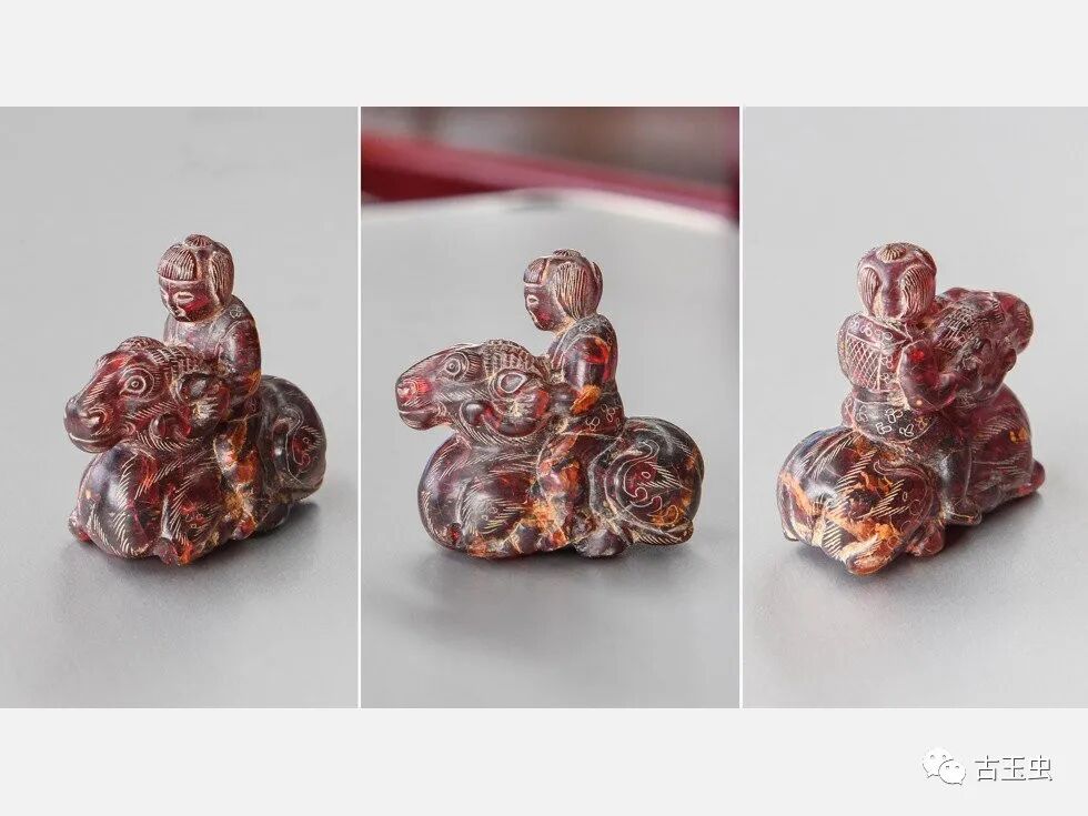 这是河南洛阳市西朱村曹魏大墓出土的琥珀人物骑羊雕刻件