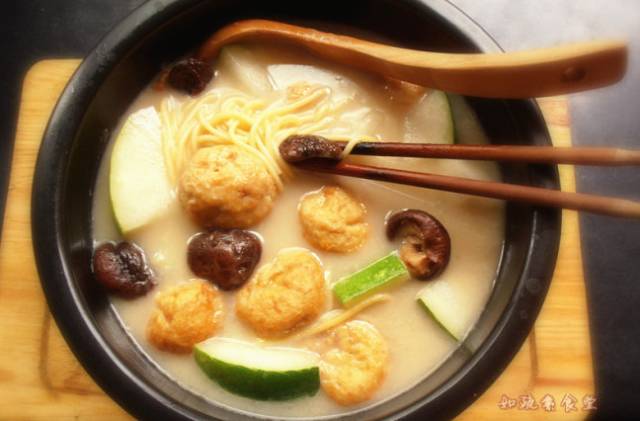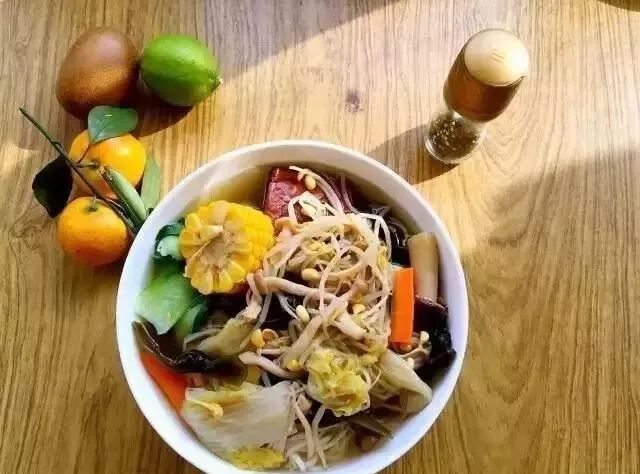 材料:素高汤(白菜、海带、白萝卜、豆芽、菌菇)、手擀面、味全高鲜、青菜、胡萝卜、盐、糖