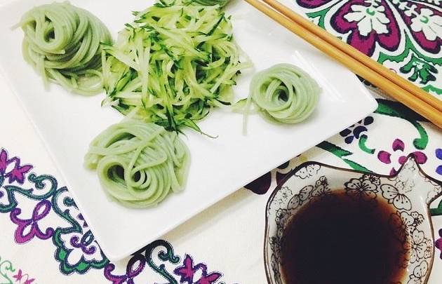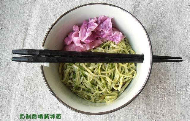 材料:抹茶面一人份,黄瓜一小段,金兰酱油、素蠔油适量