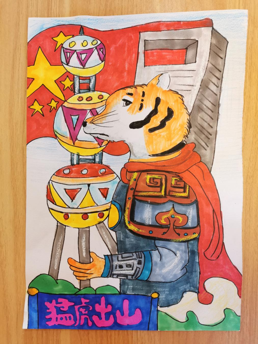 这件作品用色大胆饱和,虎的形象也较为有趣,融合海派文化和上海地标,创意较好
