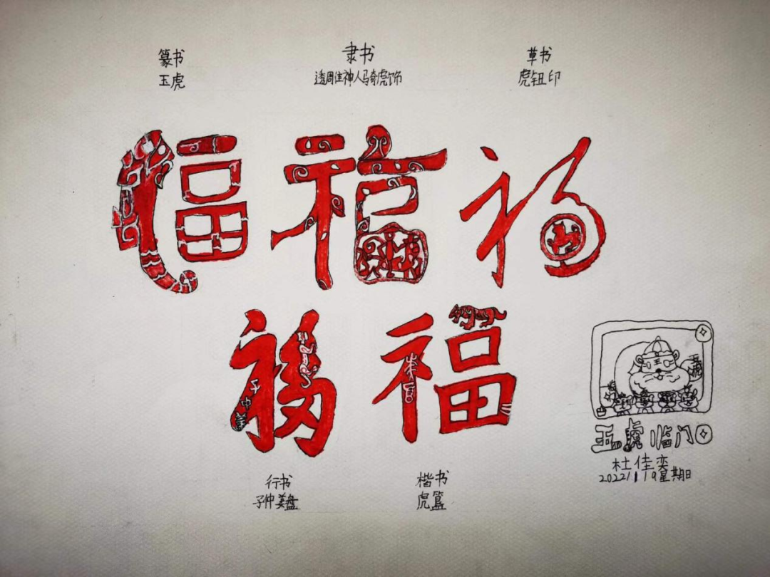 杜佳奕同学的《五虎临门》作品很有创意,借用书法篆隶楷行草的字体演变,巧妙的把与虎有关的文物结合在一起,形成汉字与图形的有机组合,其中包含篆刻、青铜器以及玉石中的虎形,对藏在古代文物中的虎的形象发展做了调查,勤动手、爱思考、有创意,这是杜佳奕同学非常好的状态体现。虎在中华民族里是不屈、积极、勇敢等诸多品质的象征,从历代文物中挖掘虎的形象演变,图形就不会单调,借用古人的智慧,从传统中寻求现代艺术的发展,为自己作品注入更多的内涵,从艺术创新角度来看是非常有意义的。